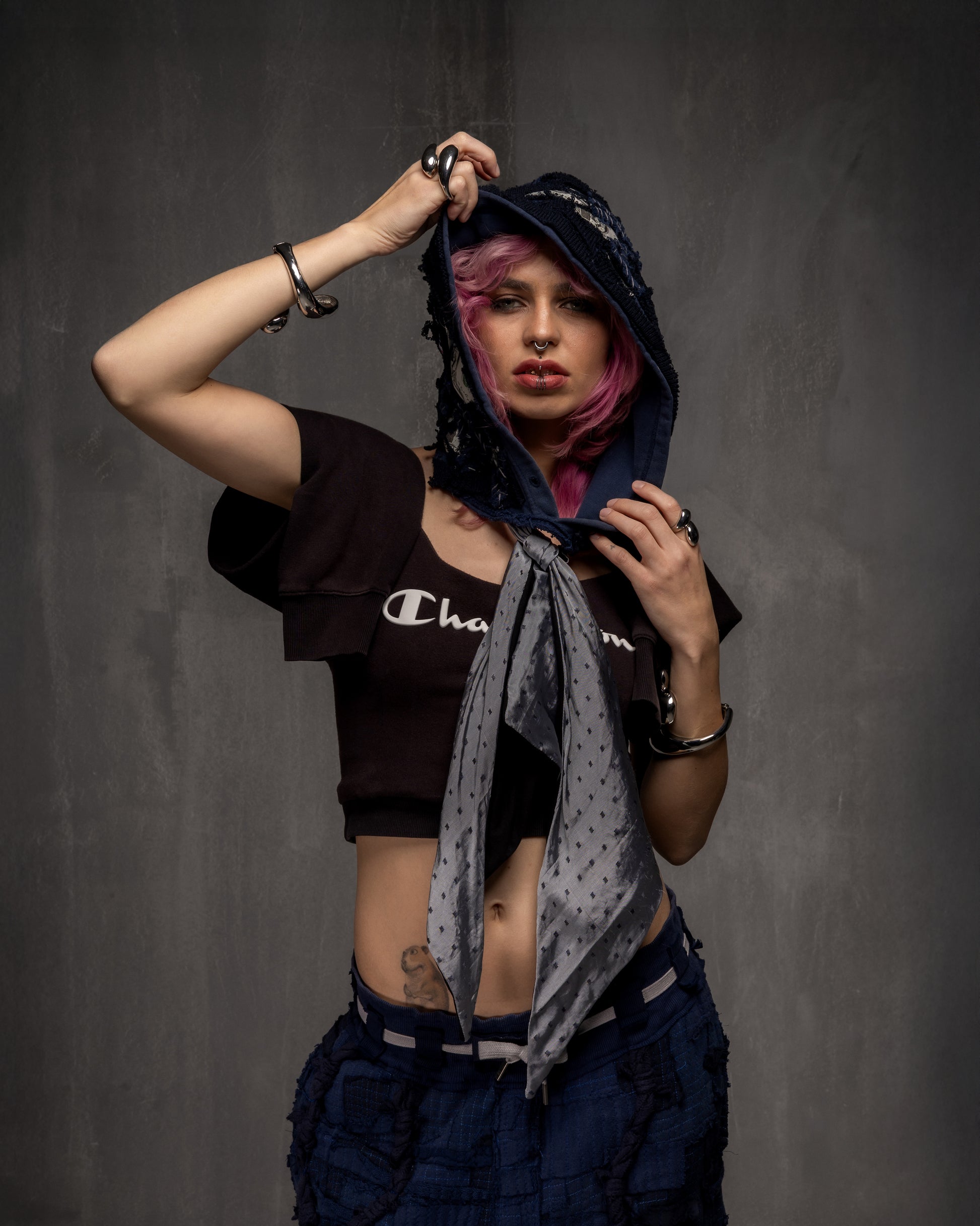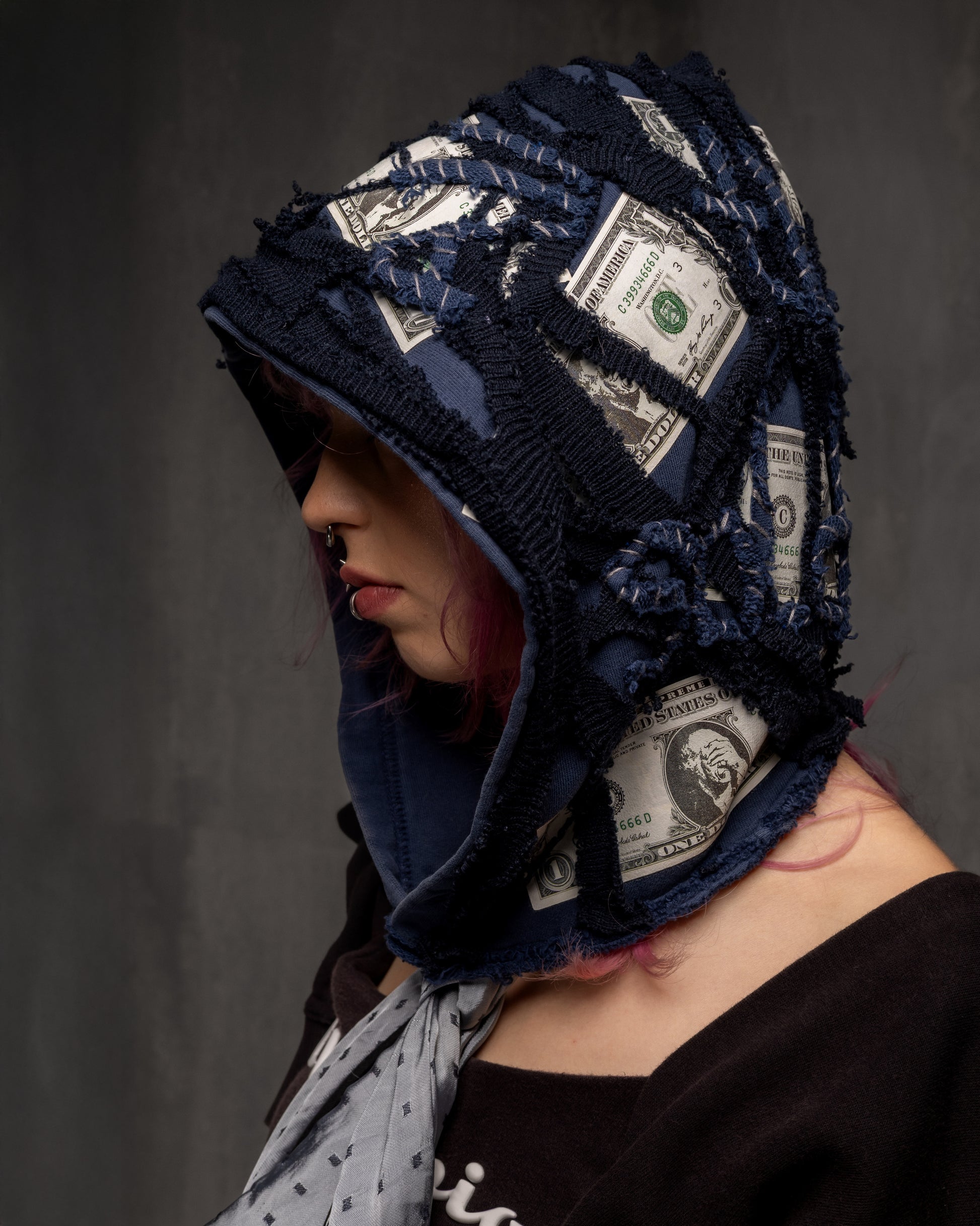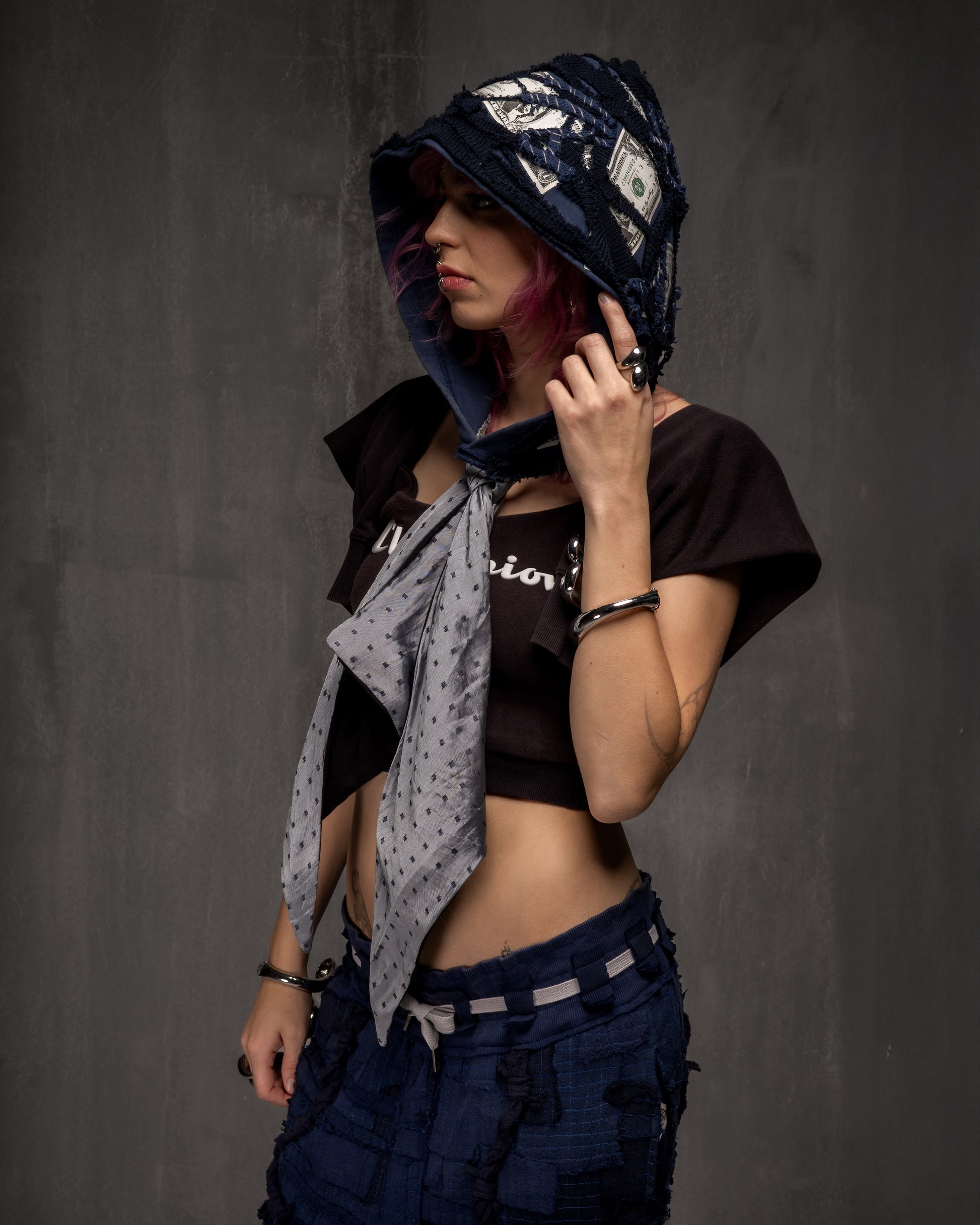 Thrifted: hood from Levi's hoodie + Champion beanie + cotton T-shirt + coupon of thai silk + iron-on patches (new)